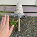 Coprinus comatus, commonly known as the shaggy ink cap, lawyer's wig, or shaggy mane, is a species of fungus. The young fruit bodies first appear as white cylinders emerging from the ground, then the bell-shaped caps open out. The white caps are covered with scales, the origin of its common names. The gills beneath the cap are white, then pink, then turn black. This mushroom is unusual because it will turn black and dissolve itself in a matter of hours after being picked or depositing spores. The mushroom is often seen growing about lawns, gravel roads, and waste areas in the Northern Hemisphere and more locally in the Southern Hemisphere. When young it is an excellent edible mushroom but it spoils quickly and resembles some poisonous species.